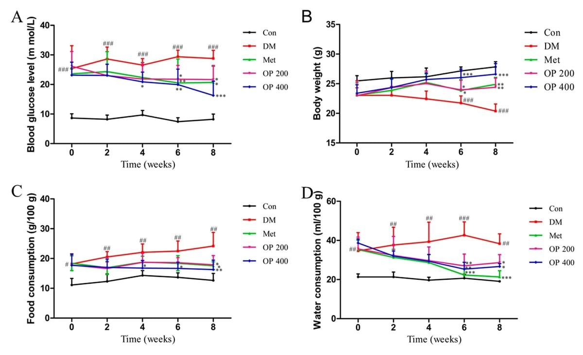 Figure 2. Effects of okra (OP) on fasting blood glucose level (A), body weight (B), food consumption (C) and water consumption (D). Data are expressed as means ± standard deviation (SD; n = 10). Con—control group treated with 0.5% sodium carboxyl methyl cellulose (CMC-Na) per day; DM—type 2 diabetes mellitus (T2DM) treated with 0.5%CMC-Naper day; Met—T2DMmice treated with 200mg/kg metformin per day; OP 200—T2DM mice treated with 200 mg/kg OP per day; OP 400—T2DM mice treated with 400 mg/kg OP per day (Liao et al., 2019)