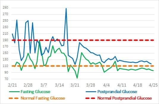 Figure 1. The fasting and postprandial glucose of a diabetic volunteer in 2 months of using GluCloZ